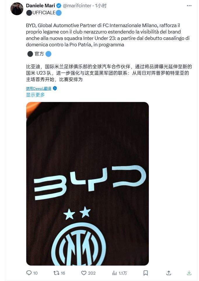 我纯跟比亚迪的合作扩大到了U23…BYD的标志将出现在国际米兰U23的官方球裤上。
